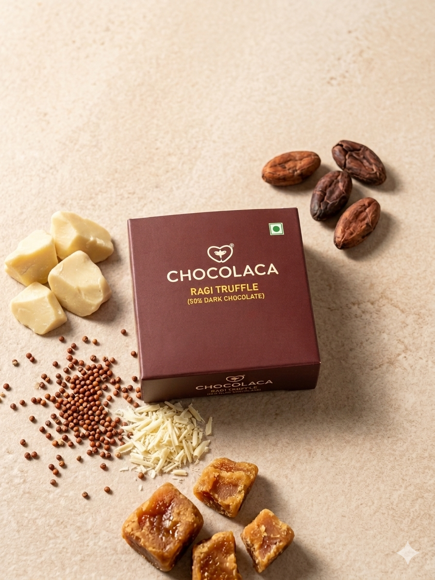 INNER FILLING IS PURE RAGI AND JAGGERY AND OUTER LAYER IS RICH 50% DARK CHOCOLATE